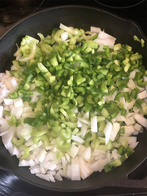 - First you are going to prepare your trinity. (Look at the recipe above for reference) You are only going to use half of the trinity as listed above. Or, you can use 1/2 of an onion, 1/2 of a bell pepper, and 3 celery stalks.