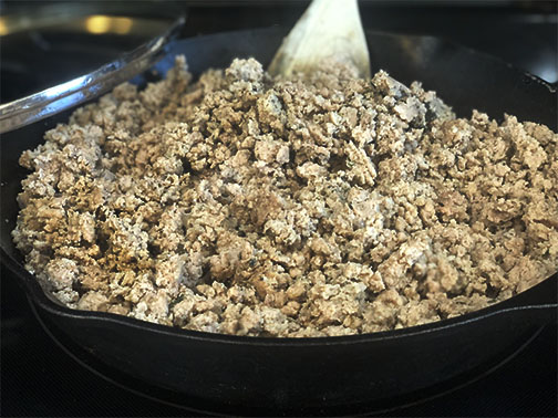 - Add combined sausage spices to the ground meat. ( You can do this in a mixing bowl, or in your oiled skillet with a spatula. I usually just add the meat to the skillet first, then add the sausage spices.)