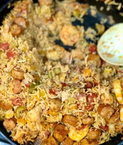 This year for Mardi Gras, I want to share with you one of my family favorites, jambalaya. Jambalaya is a rice-based dish with chicken, andouille sausage, shrimp, tomatoes, and the trinity (bell pepper, onion, and celery). Traditionally these are combined in a cast iron skillet, and cooked together with chicken broth until the rice is cooked. With all of the ingredients combined before cooking the rice, it creates an amazing, flavorful rice upon completion. This dish is fairly easy to make gluten-free also. With more companies becoming aware of the need for gluten-free foods, gluten-free andouille sausage is becoming easier to find at traditional grocery stores. You will want to make sure your cajun seasoning is gluten-free as well. If you cannot find that, I will add a link to my blog from Mardi Gras last year, that has my cajun seasoning recipe. It can be found here; Dirty Rice